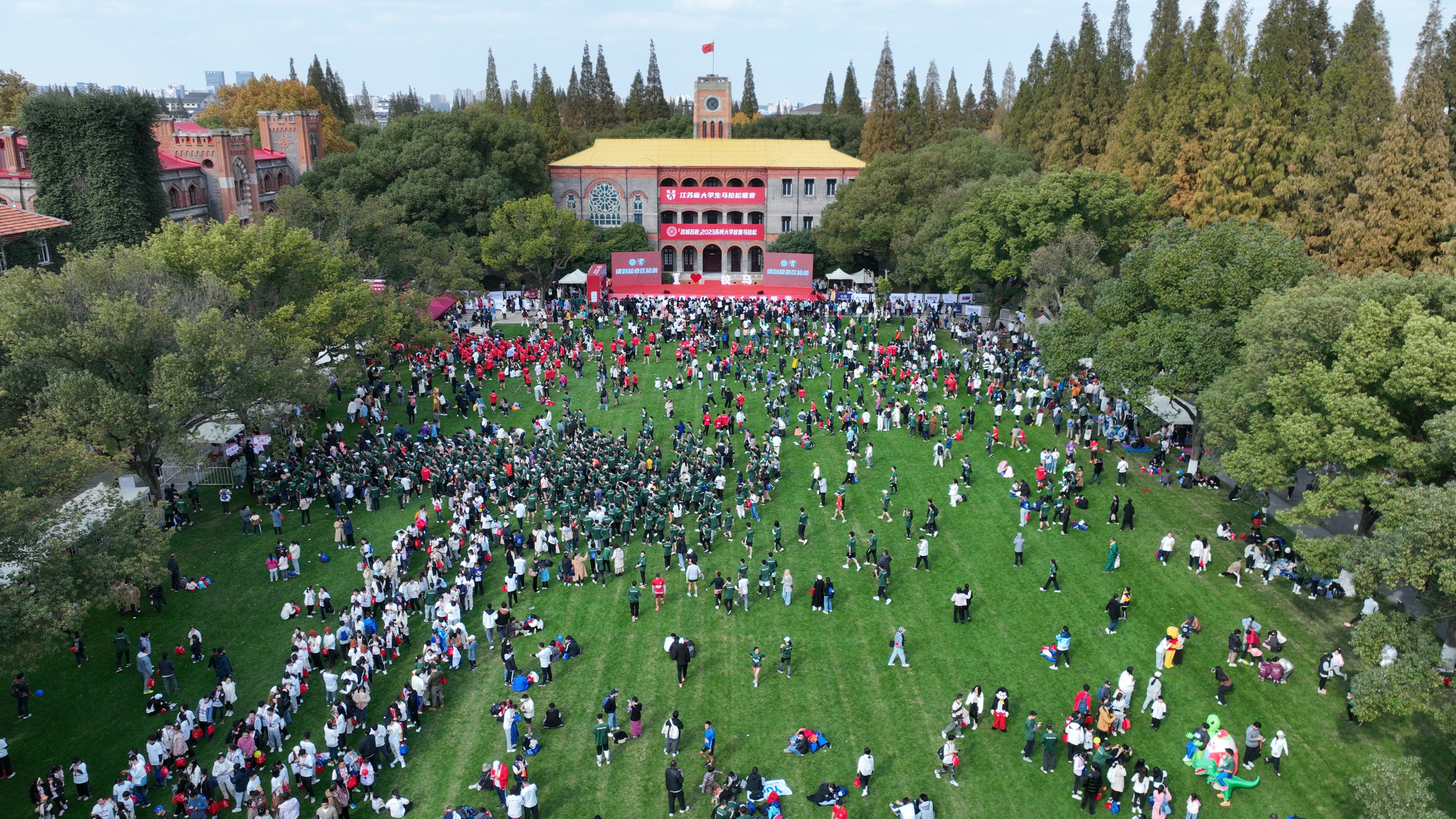 在激动澎湃的音乐声中,参赛者纷纷在钟楼前草坪集合。歌舞、啦啦操、舞龙舞狮,苏大学子和苏大幼儿园的小朋友带来了精彩表演为跑者们加油打气。出席活动的领导和嘉宾上台,共同为“名城名校”2023苏州大学校园马拉松赛暨江苏省大学生马拉松联赛各项赛事鸣笛发枪。