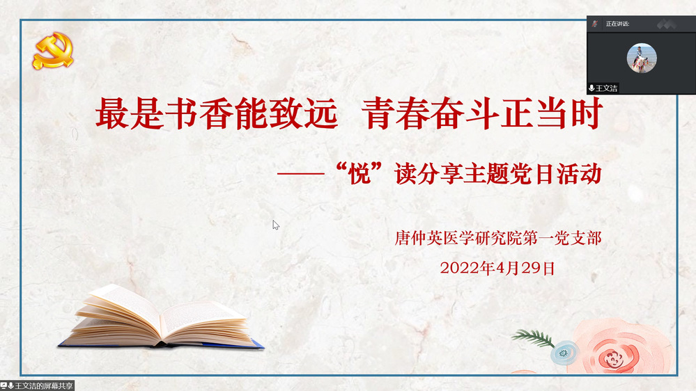 草长莺飞四月天,正是读书好时节。为深入贯彻习近平总书记关于读书学习的重要论述精神,推进学习型基层党组织建设,营造书香环境迎接“五四”青年节,4月29日下午,唐仲英医学研究院第一党支部以腾讯会议线上形式开展了“最是书香能致远,青春奋斗正当时”的悦读分享主题党日活动。活动由唐仲英一支部书记王文洁主持,支部全体党员参与了本次活动分享。