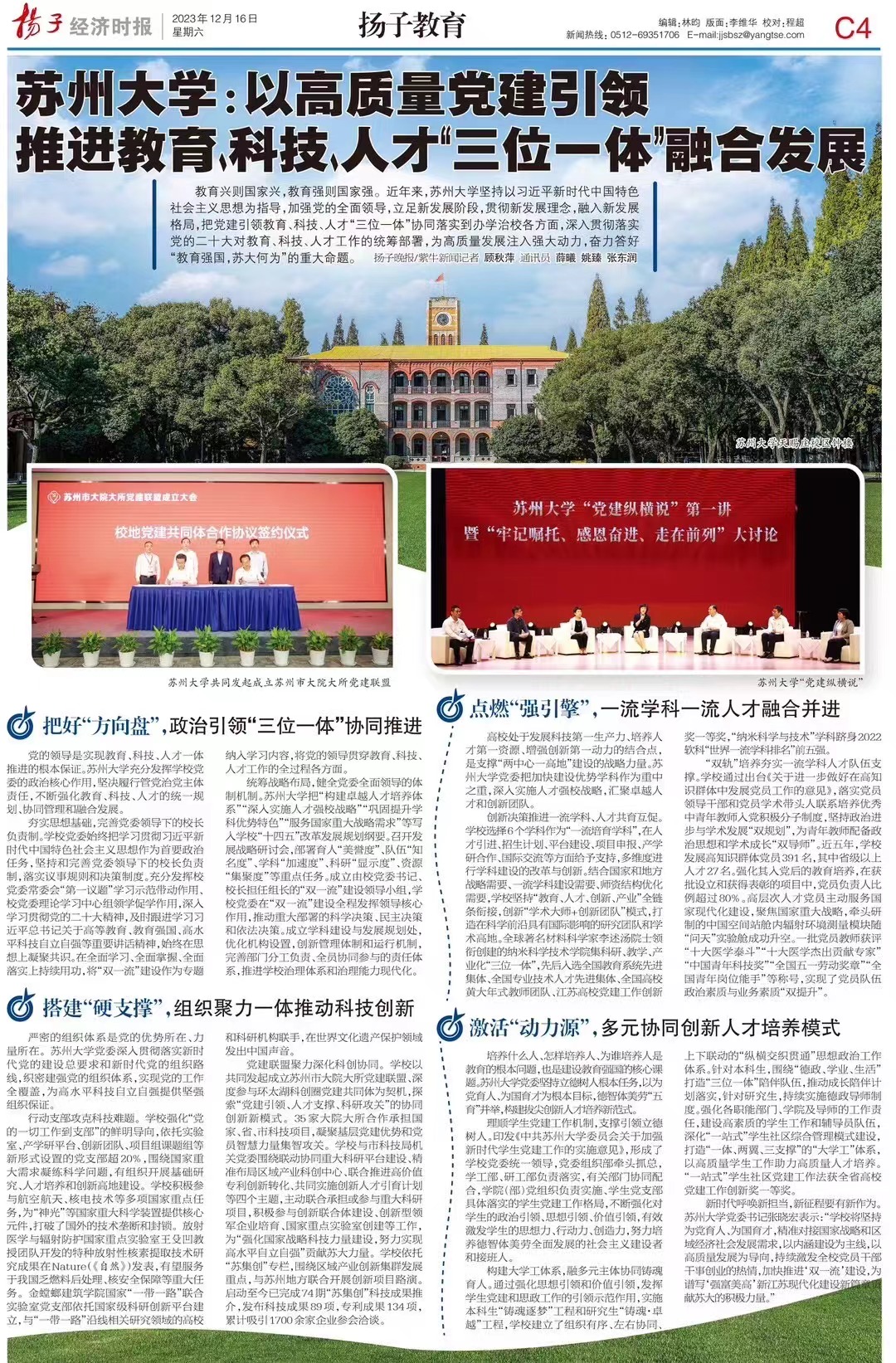 《扬子晚报》:苏州大学:以高质量党建引领推进教育、科技、人才“三位一体”融合发展