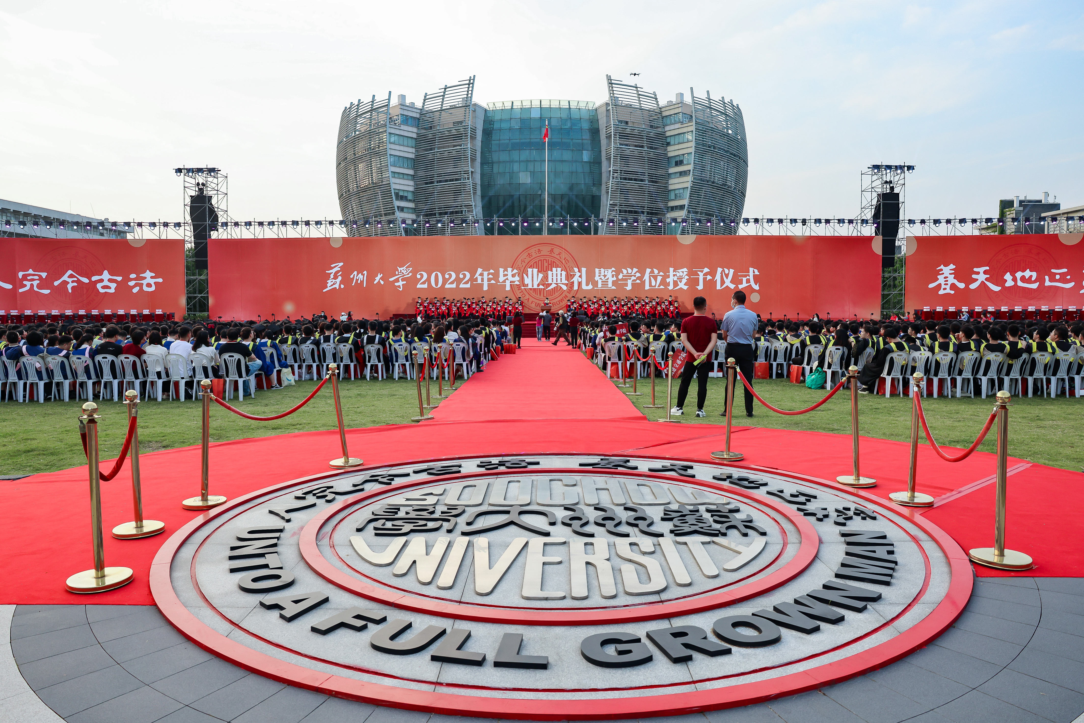 六月的苏州,蝉鸣盛夏,栀子花开。6月21日晚,苏州大学在独墅湖校区恩玲艺术中心户外草坪举行2022年毕业典礼暨学位授予仪式,万余名毕业生通过线上线下方式参与,同上最后一堂大思政课。师长的谆谆教诲、书写时代乐章的美育音乐会、礼赞青春的灯光秀表演……这场充满思政元素的毕业典礼,激发毕业生们深怀爱国之心、砥砺报国之志、勇挑强国重任。
