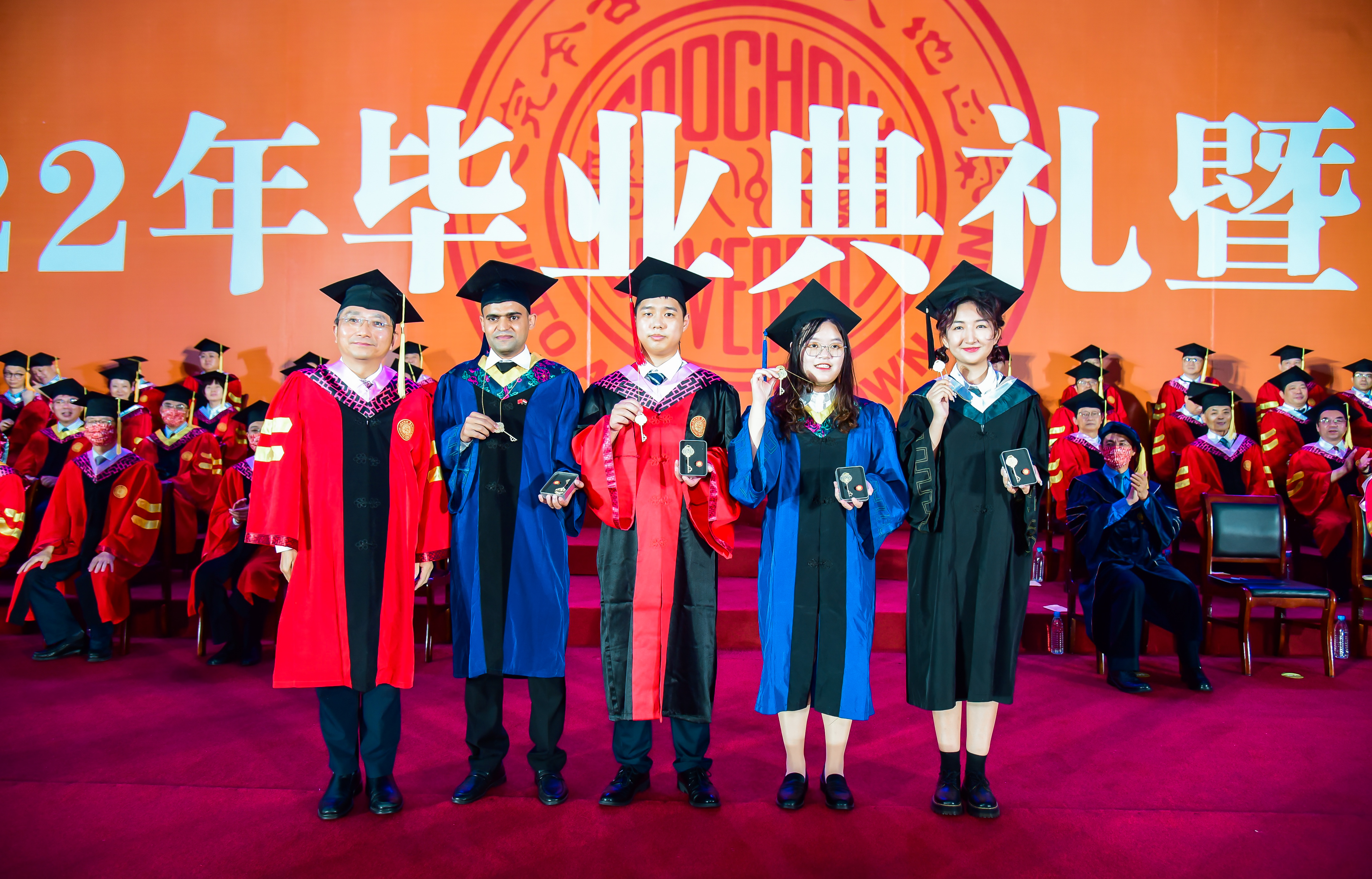 临别之际,校党委书记江涌分别为本科生代表、苏州大学苏州医学院祖拜热·依斯坎代尔同学,硕士生代表、轨道交通学院吴茜同学,博士生代表、马克思主义学院毛瑞康同学,留学生代表、金螳螂建筑学院汉森同学赠送毕业纪念品,并与同学们合影留念,期望同学们带着母校的眷念和祝福,开启新的人生旅程。