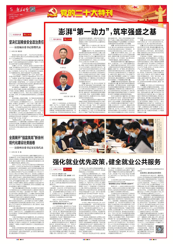 10月16日至22日,中国共产党第二十次全国代表大会在北京胜利召开。党的二十大代表、苏州大学党委书记江涌参加盛会,并接受《人民日报》、新华社、《光明日报》、《中国教育报》、《新华日报》、江苏卫视、《苏州日报》等国家和省市级媒体采访,分享学习收获和感想感悟,介绍学校五年来发展成绩和未来发展目标和工作任务。