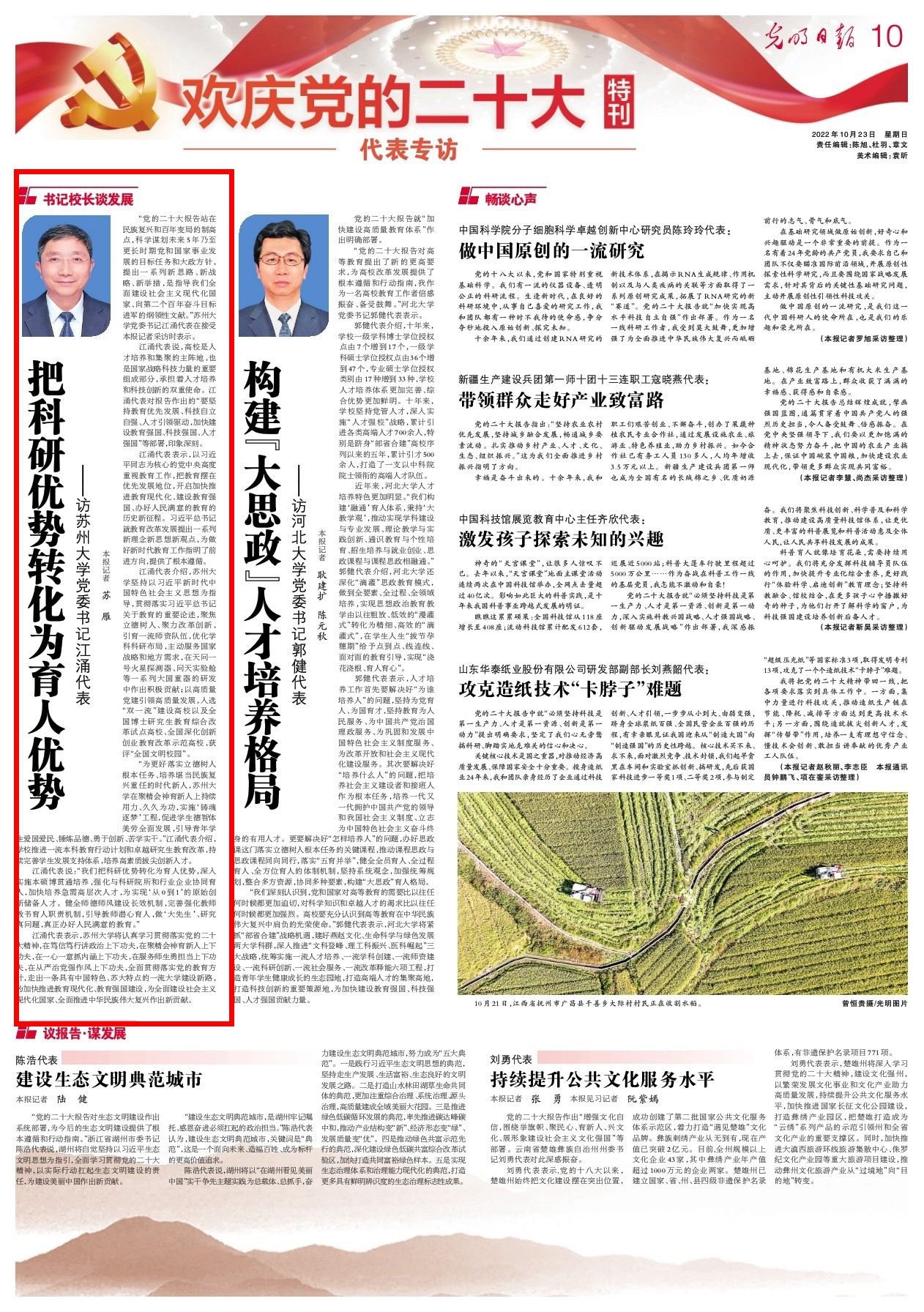 “党的二十大报告高瞻远瞩、气势磅礴、继往开来,能在现场聆听报告,我倍感振奋、深受教育。”党的二十大代表、苏州大学党委书记江涌表示,党的二十大报告中的“实施科教兴国战略”,引起他的共鸣。在他看来,将教育、科技、人才作为全面建设社会主义现代化国家的基础性、战略性支撑,体现了我们党对教育事业的重视,这也为高校人才培养工作指明了前进方向、提出了更高标准、注入了磅礴动力。
