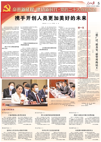 “全球化时代,各国命运休戚与共。国际上的事应该由大家共同商量着办,世界前途命运应该由各国共同掌握。”苏州大学党委书记江涌代表说,面对世界之变、时代之变、历史之变,更需要各国共同维护国际关系基本准则、维护国际公平正义。“维护世界和平,促进共同发展,推动构建人类命运共同体,是中国外交政策的宗旨和目标。党的二十大报告向世界宣示了中国外交的胸怀与气魄,为世界注入正能量。”