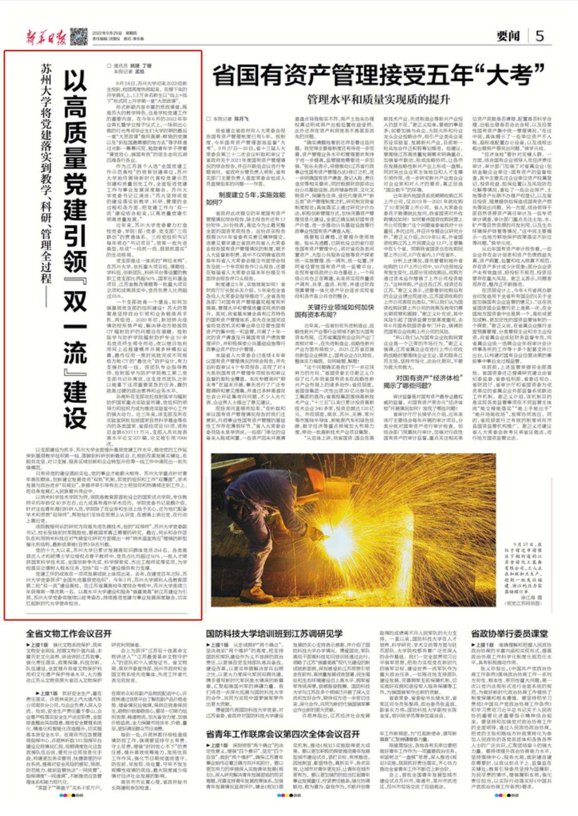 《新华日报》:苏州大学将党建落实到教学、科研、管理全过程—— 以高质量党建引领“双一流”建设